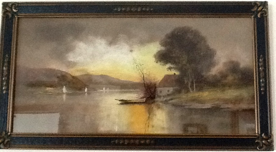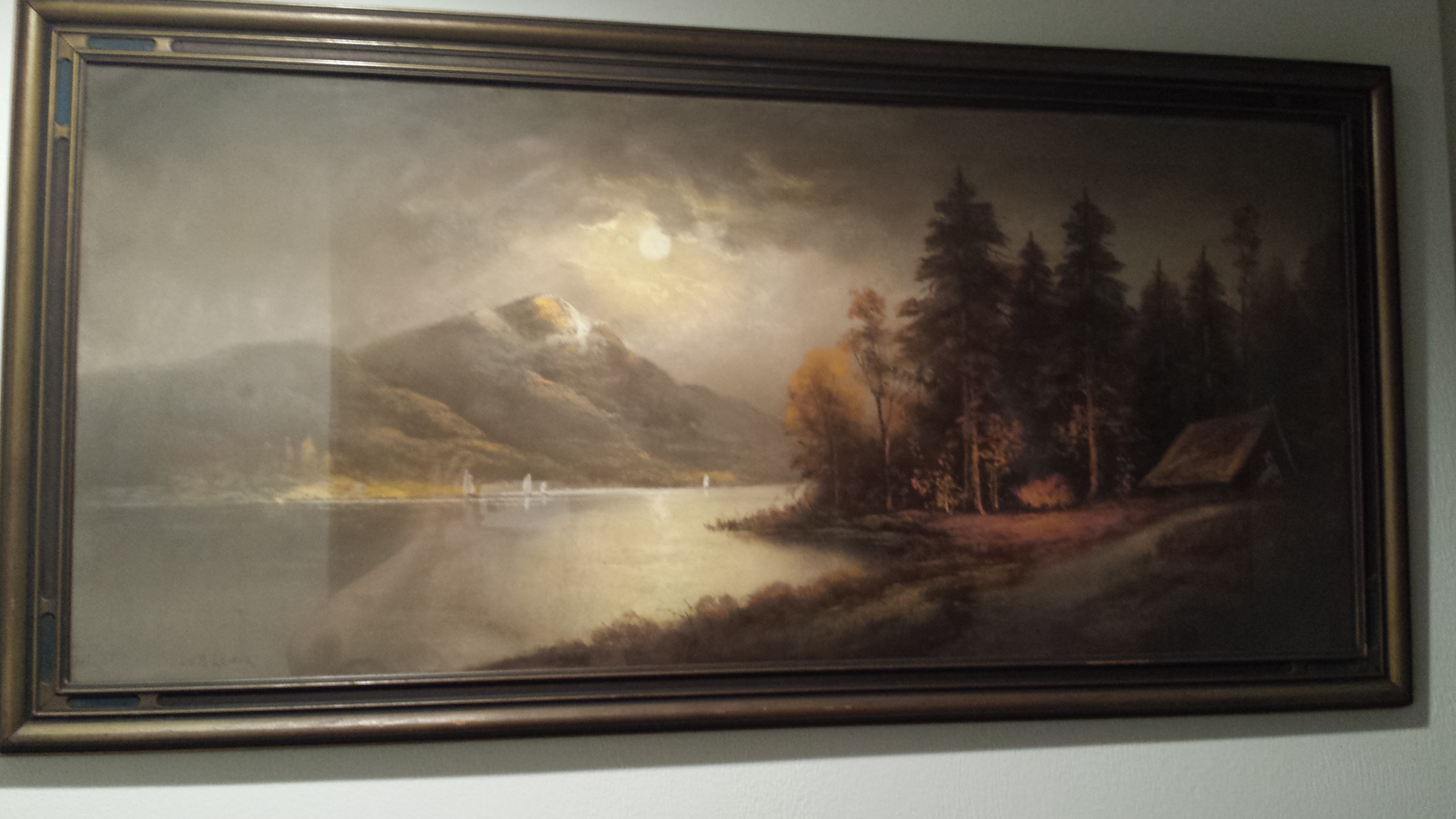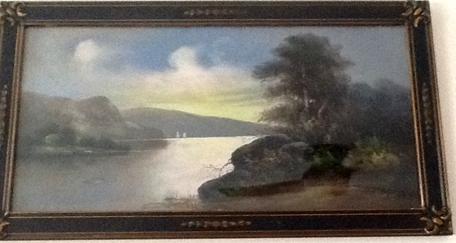 Judy wrote: “Just read most of your book, my family is from Pittsburgh and we have lived in Daytona Beach Florida for the last 36 odd years. We have an H.R. Lewis and have not investigated whether it is a print of an original. We have had it since the early 1970s, however the owners Mr. and Mrs. Knight had it in their home since 1905. This landscape, like you wrote about the boy scout theme and sailboat on lake…it is a lake with sail boats, a mountain in back ground, full moon lit night and on the shore to the right is a campfire and tent with a figure in it, among pine trees near the shore.”